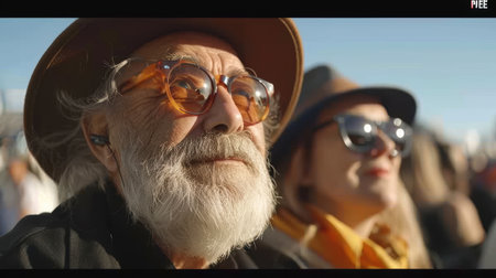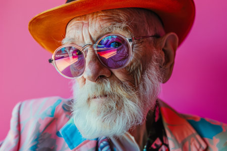 Stylish elderly man with white beard and orange glasses relaxing in a colorful outfit, exuding confidence and eccentric charm.