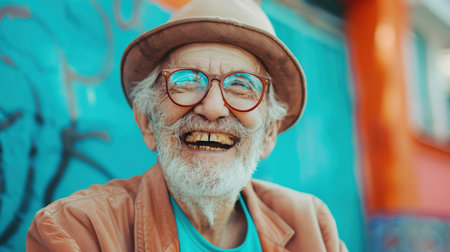 An elderly man with glasses laughing contagiously on a colorful urban street, radiating warmth and happiness. World Laughter Day
