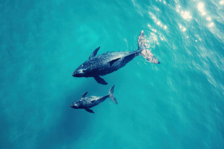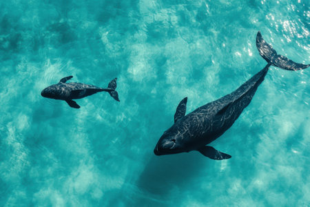 A mother whale and her calf glide together through the serene and clear blue ocean waters, highlighting their bond in natures tranquility.