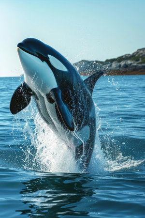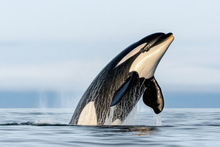 An orca whale leaps from the calm ocean waters, sending droplets cascading off its sleek black and white body. The moment captures the majesty of marine wildlife in its natural habitat.