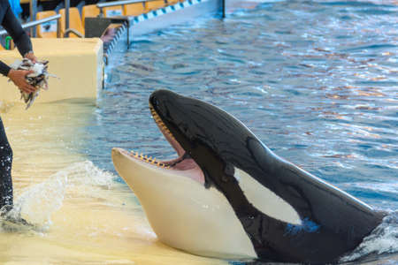 Zookeeper feeding orca whale and taking care of huge hunger.