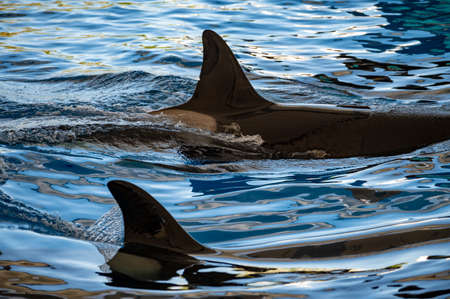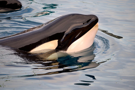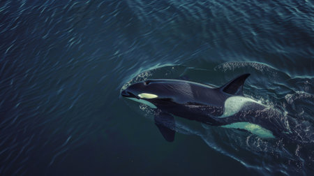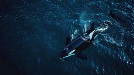 Pair of orca whales gracefully moving through the ocean waters, with an atmosphere both attractive and serene.