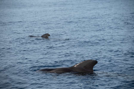 Whales watching from boat, spotted family of whales near coast of Tenerife, Canary islands, Spain in winter