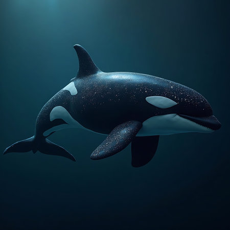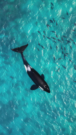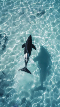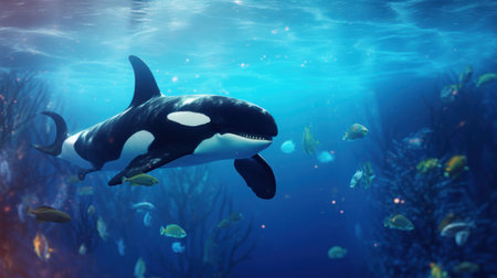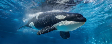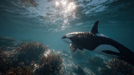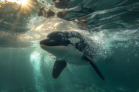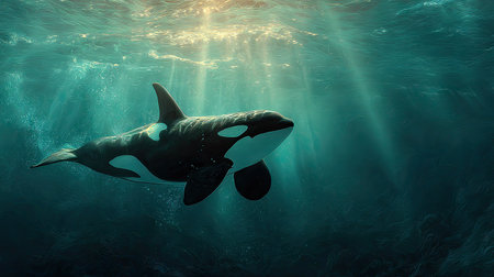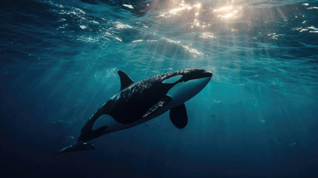 An orca, a large marine mammal, is seen swimming underwater. The image presents the creature in its natural habitat, with sunlight filtering through the water. The composition showcases the animal's black and white pattern in a detailed and realistic style, ideal for various editorial and commercial applications.