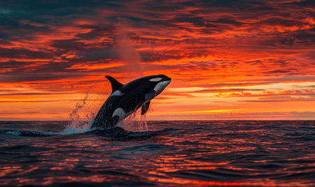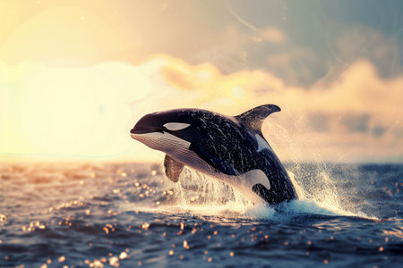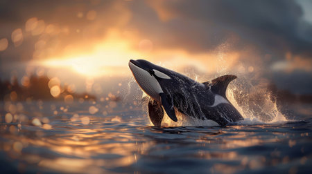 Majestic killer whale breaching ocean surface, powerful splashes, dramatic sunset, strength, grace, dynamic scene, vivid and powerful.