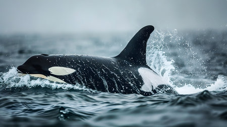 A powerful orca, also known as a killer whale, majestically swims through the water, its sleek black and white body cutting through the waves. With dorsal fin prominent, the orca gracefully moves through its marine habitat.