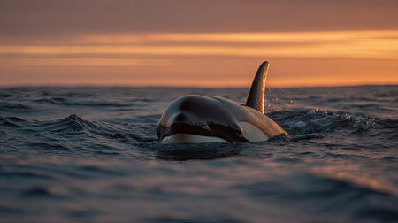 An orca whale surfaces in the ocean with a stunning sunset backdrop. The image displays a shallow depth of field, focusing on the whale and textured water. The warm orange and dark blue tones create a moody and cinematic atmosphere, suitable for various editorial and commercial applications.