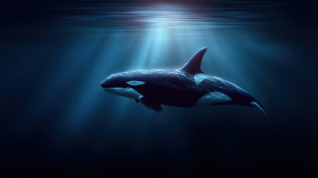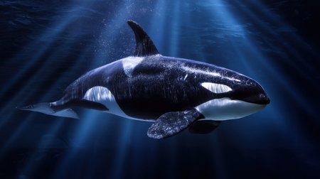 An orca glides effortlessly through deep ocean waters, illuminated by beams of sunlight filtering down from above. This stunning scene captures the beauty of marine life.
