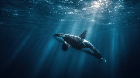 An orca glides smoothly through the deep blue ocean, illuminated by shafts of sunlight. This stunning underwater scene captures the beauty of marine wildlife in natural habitat.