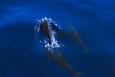 A family of wild dolphins swims in the bright blue clear water of a tropical sea. Beautiful weather on a sea voyage