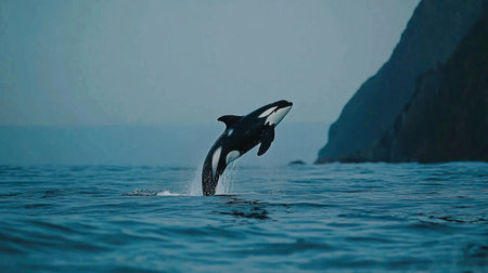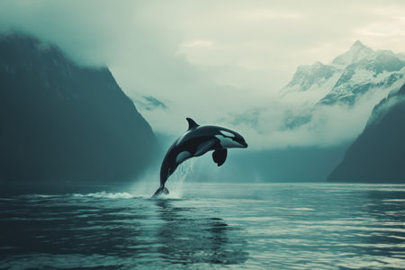 Orca whale jumping in calm ocean with foggy background, creating minimalist and serene atmosphere