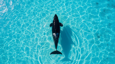 Aerial view of a killer whale swimming in crystal clear water.