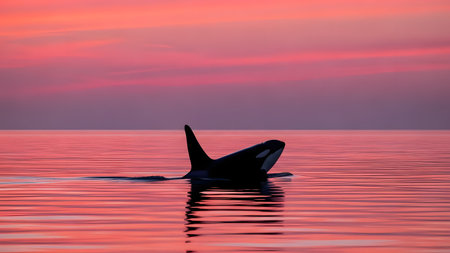 A silhouette of an orca surfacing in a calm ocean against a vibrant pink and purple sunset sky. The killer whale's dorsal fin cuts through the water, creating a peaceful and artistic marine composition.