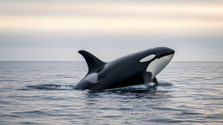 A majestic orca, or killer whale, breaches the surface of a calm, grey ocean, displaying its prominent dorsal fin and black-and-white markings. The scene highlights the grace and power of marine wildlife in their natural habitat.