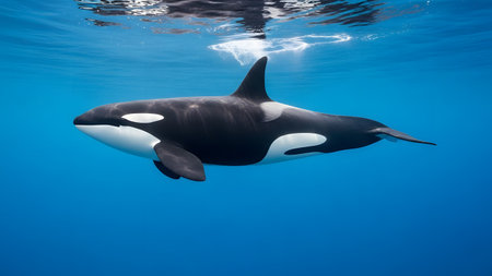 A majestic orca or killer whale swims elegantly just beneath the surface of the deep blue ocean. The black and white marine mammal is captured in profile showcasing its powerful form in its natural habitat.