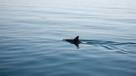 A minimalist shot of a dolphin's dorsal fin breaking the surface of a calm, vast blue ocean. The ripples in the water trail behind the marine mammal, highlighting the serenity and vastness of the open sea environment.