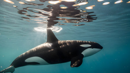 A majestic Orca (Killer Whale) swimming just below the ocean surface, with sunlight reflecting off its sleek black and white body. The underwater perspective captures the grace and power of this apex predator.
