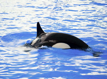 Orcinus orca killer whale swimming in the blue water.