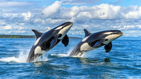 Two orcas leap joyfully from the ocean's surface, showcasing their strength and grace. Enjoy the vibrant scenery, with a clear blue sky and fluffy clouds above.