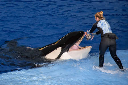 Orlando, Florida. November 16, 2019. Woman trainer feeding a killer whale in Miracle Show at Seaworld (9)