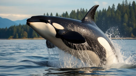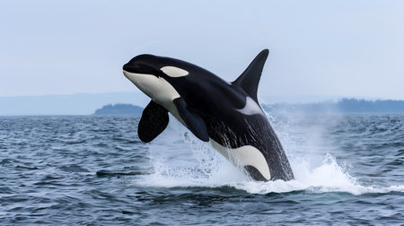 Powerful orca leaps from ocean surface, showcasing marine wildlife action, strength, and freedom in the wild sea.