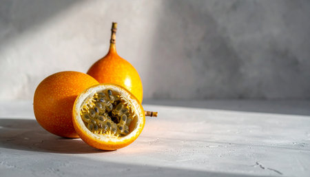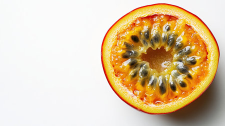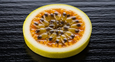 Half of a ripe passion fruit revealing its vibrant yellow pulp and dark seeds. a tropical, healthy, and exotic fruit rich in vitamins.