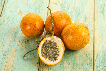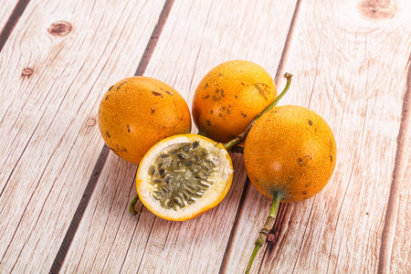 Organic raw ripe yellow granadilla passion fruit on wooden background