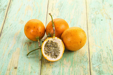Granadilla or Grenadia Passionfruit Whole EXotic Fruits on Wooden Board.