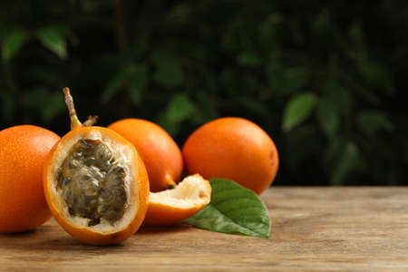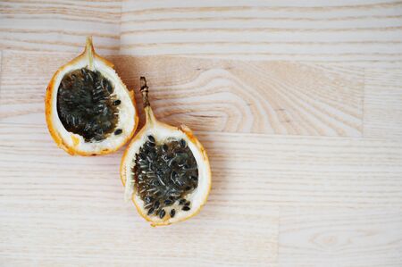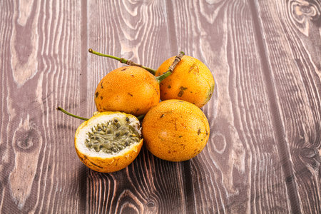 Fresh sweet granadilla whole and halves on wooden table