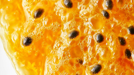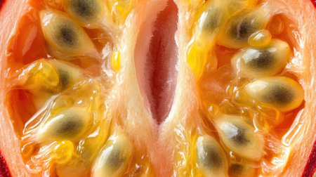 Macro shot of passion fruit pulp and seeds, highlighting its vibrant yellow color and juicy, tropical texture.