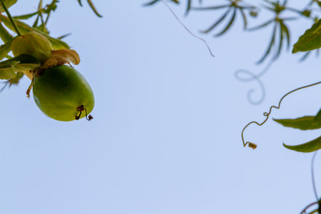 Close up of passion fruit on the vine, selective focus.