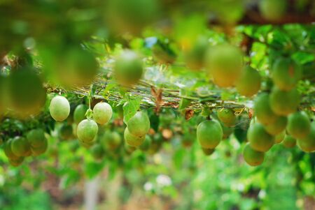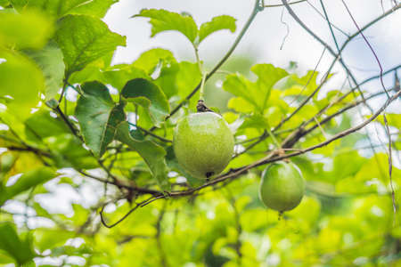 lots of raw and fresh passion fruit on the tree, passion fruit farm