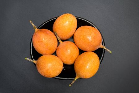 granadilla fruits - exotic tropical fruits in a bowl on black background - studio shot from above
