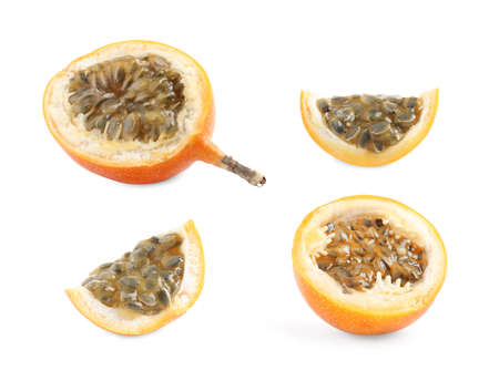 Set with delicious granadillas on white background