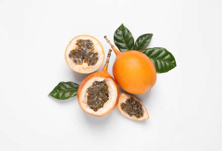 Delicious ripe granadillas with leaves on white background, flat lay