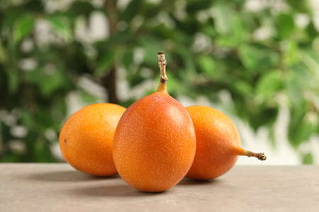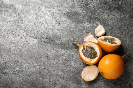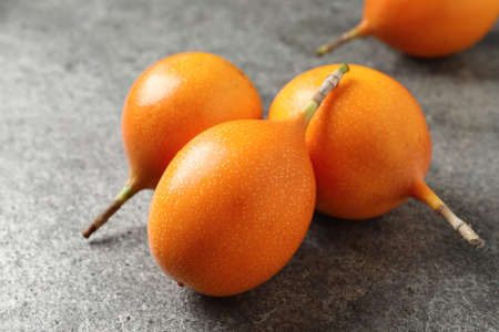 Whole delicious ripe granadillas on gray table