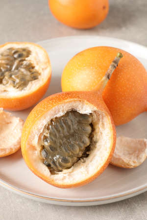 Granadilla, tasty exotic fruit on a metal plate
