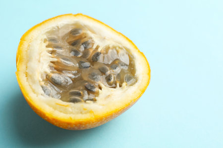 Piece of ripe yellow passion fruit on light blue background, closeup. Space for text
