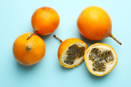 Picture of ripe fresh granadilla on blue background