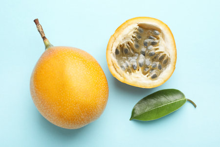 Ripe yellow passion fruits and leaf on light blue background, flat lay