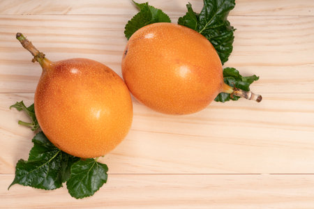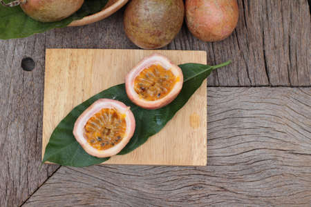 Fresh granadillas on wooden board with leaves.