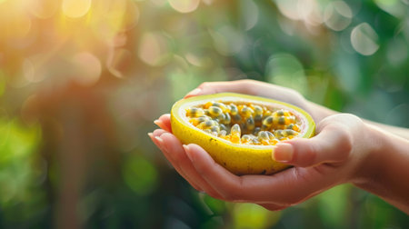 A halved passion fruit reveals its bright, juicy interior filled with seeds. This vibrant image captures the essence of tropical flavors, perfect for food and health-related themes.