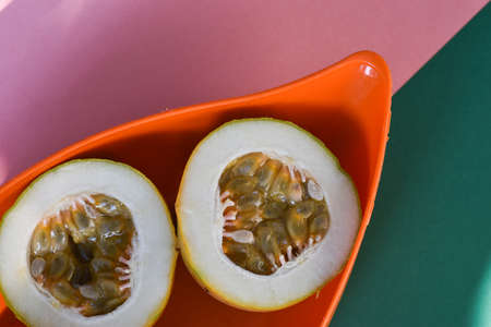 bluecrown passion fruits also known as Passiflora caerulea in fruit bowl with one cut in half to show the seeds inside, simple food ingredients concept