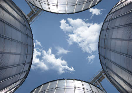 Grain elevator silos closeup with cloudy sky on the background