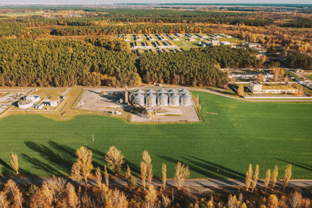 Aerial view modern granary, grain-drying complex, commercial grain or seed silos in sunny autumn rural landscape. Corn dryer silos, inland grain terminal, grain elevators standing in a field