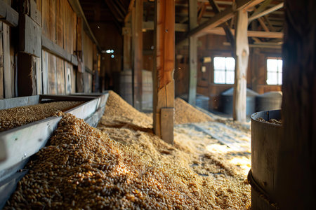 A detailed view of a traditional grain mill, showcasing freshly ground grains, rustic tools, and an artisanal approach to food production in a sustainable workshop environment.