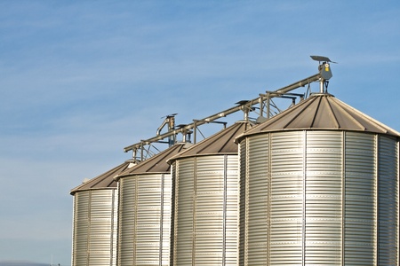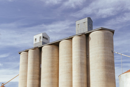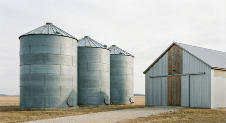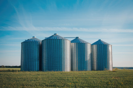 Grain silos storing harvested crops on agricultural land, representing modern farming practices and food security