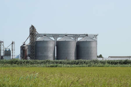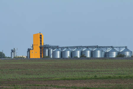 Grain elevator. Metal grain elevator in agricultural zone. Agriculture storage for harvest. Grain elevators on green nature background. Exterior of agricultural factory. Nobody.