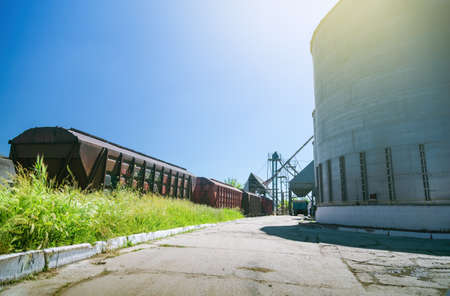 Agricultural silo at feed mill factory. Flat silo for store and drying grain, wheat, corn at farm. Storage of agricultural product. Big tank for store grain. Grain stock tower. Agriculture industry.
