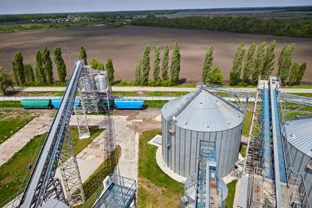 modern granary elevator and seed cleaning line in silver silos on agro-processing and manufacturing plant for storage and processing drying cleaning of agricultural products, flour, cereals and grain